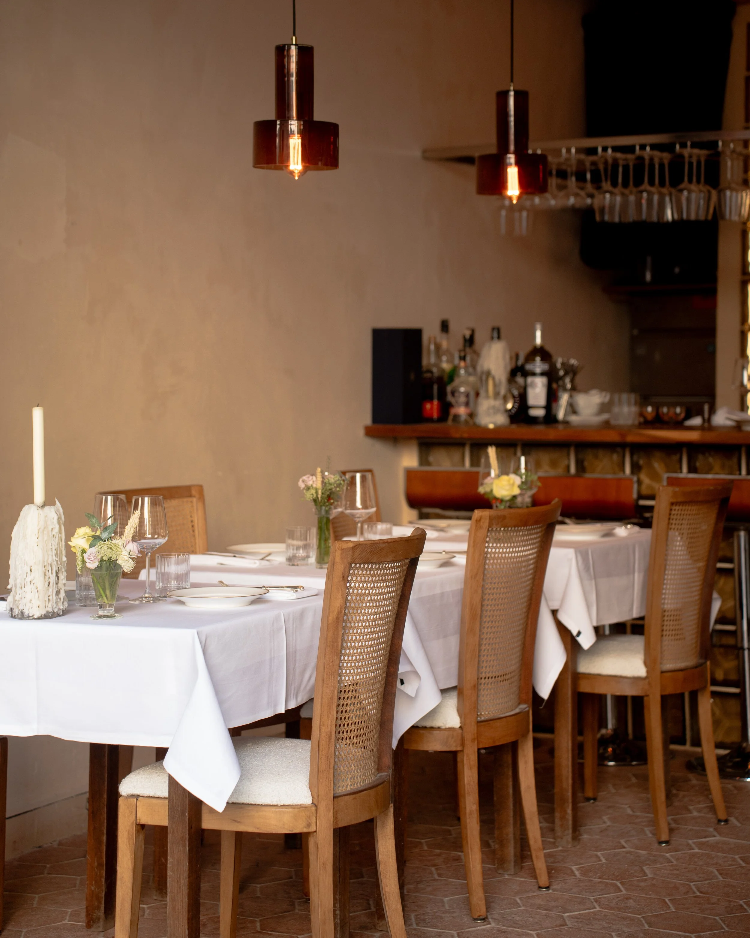 La Baignoire séduit par une ambiance élégamment rétro et romantique. Avec des nappes blanches impeccables, une porcelaine au liseré doré, des chandeliers antiques, des bouquets de fleurs sauvages et une entrée ornée de 8000 carreaux gravés, chaque détail invite à la contemplation. L’atmosphère chaleureuse et sophistiquée en fait le lieu idéal pour une soirée en amoureux ou une expérience culinaire hors du commun.